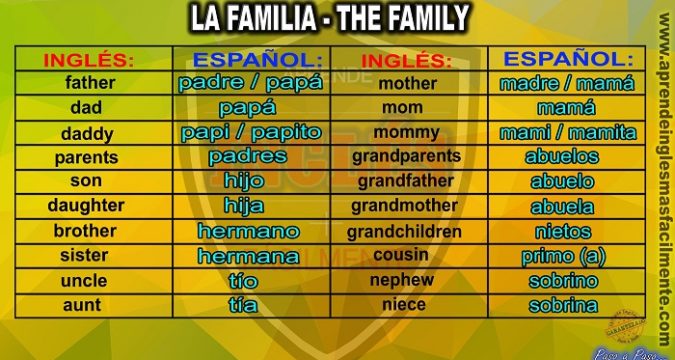 En esta ocasión aprenderás a mencionar a cada uno de los integrantes de la familia → The family, espero que te lo aprendas para que continuemos luego a utilizarlos en nuestras frases que empezaremos a formular posteriormente: